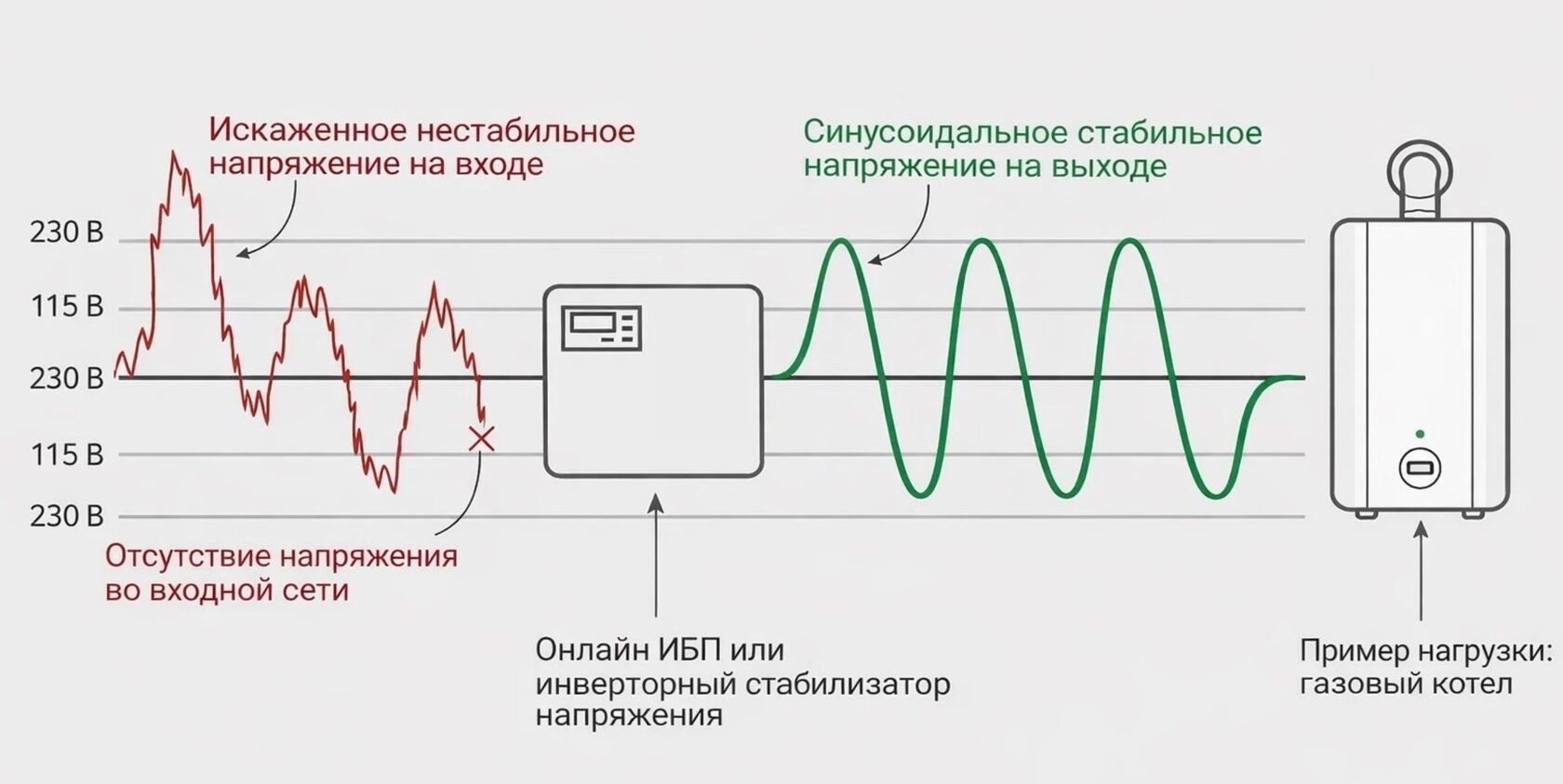 Для защиты чувствительной электроники и газового оборудования сегодня важно не только стабилизировать напряжение, но и обеспечить бесперебойное питание. Кратковременное отключение электричества может вызвать сбой в работе газового котла, остановку циркуляционного насоса и разморозку системы.